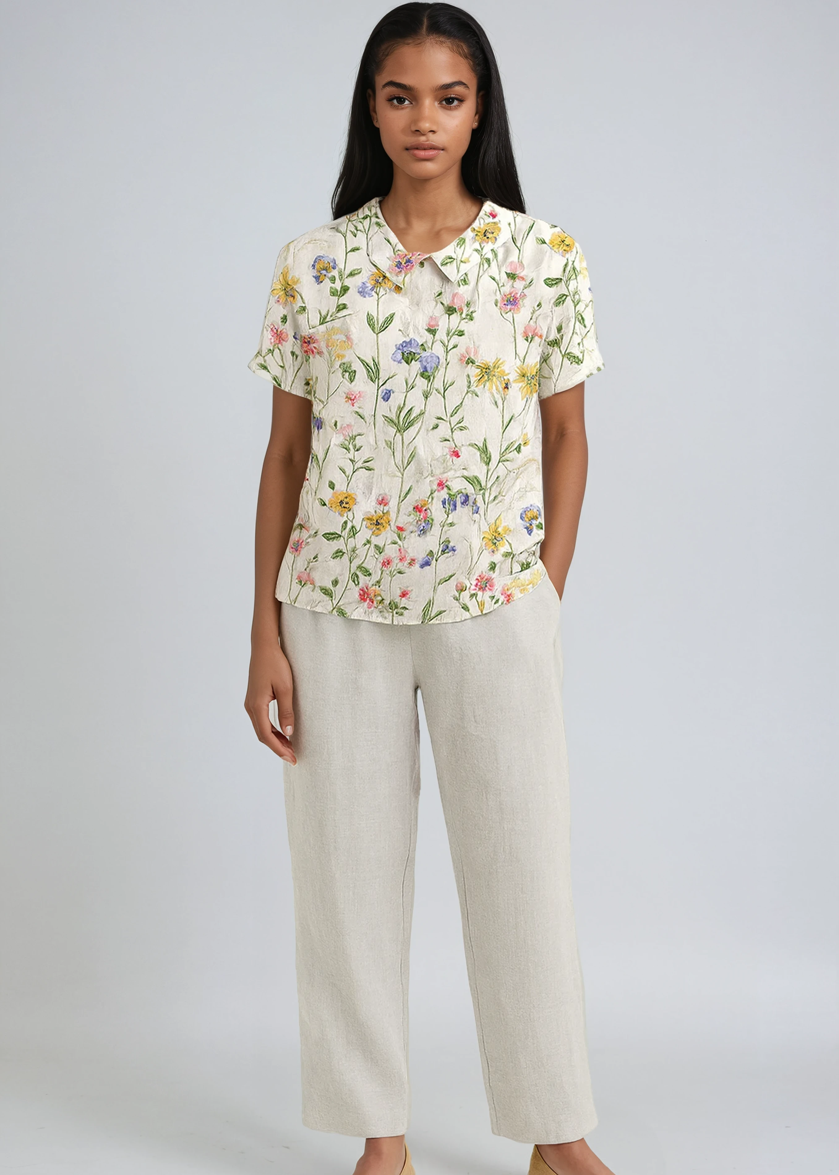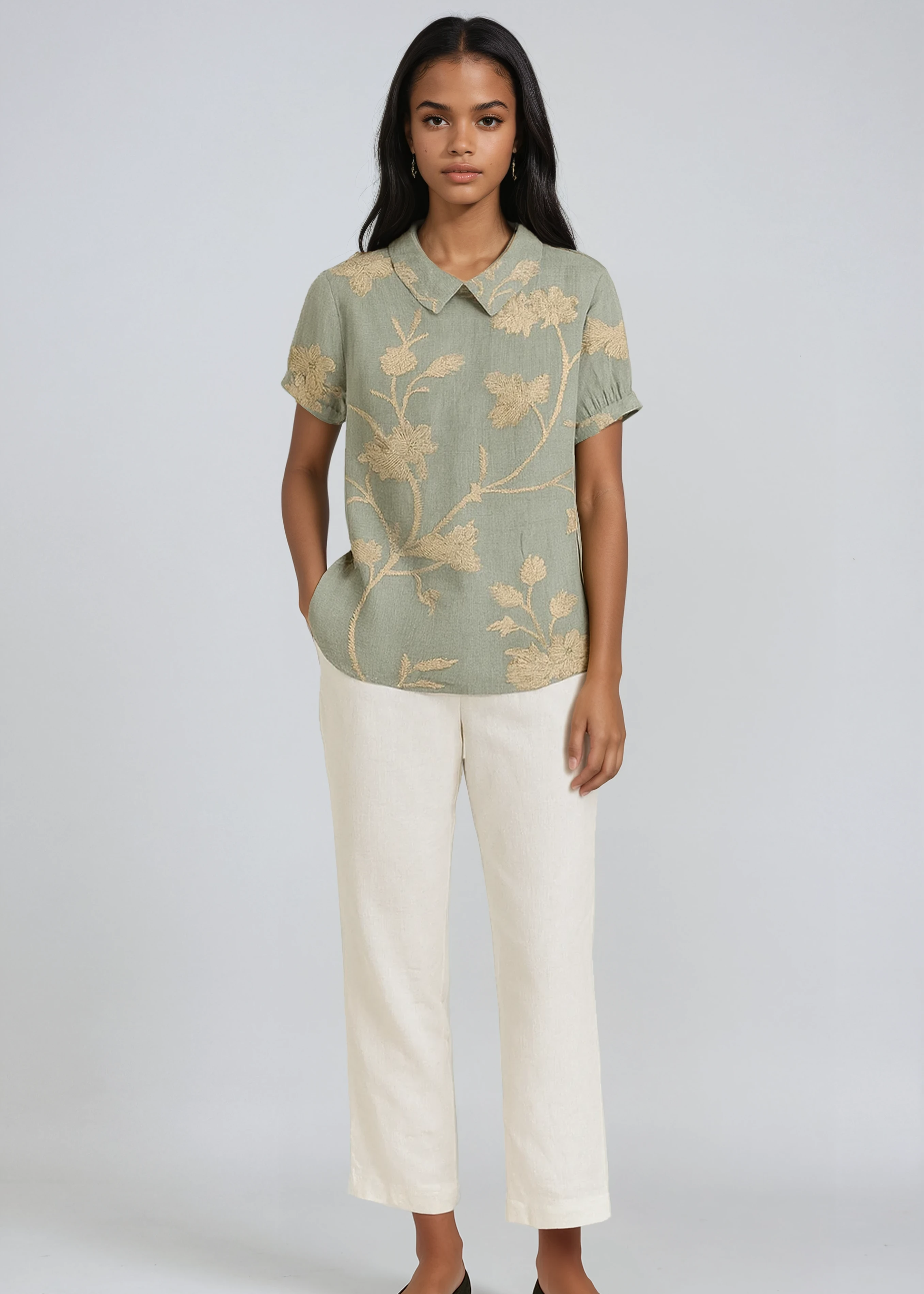 Luna Fashion House | GREEN LINEN BLOUSE WITH FLORAL EMBROIDERY